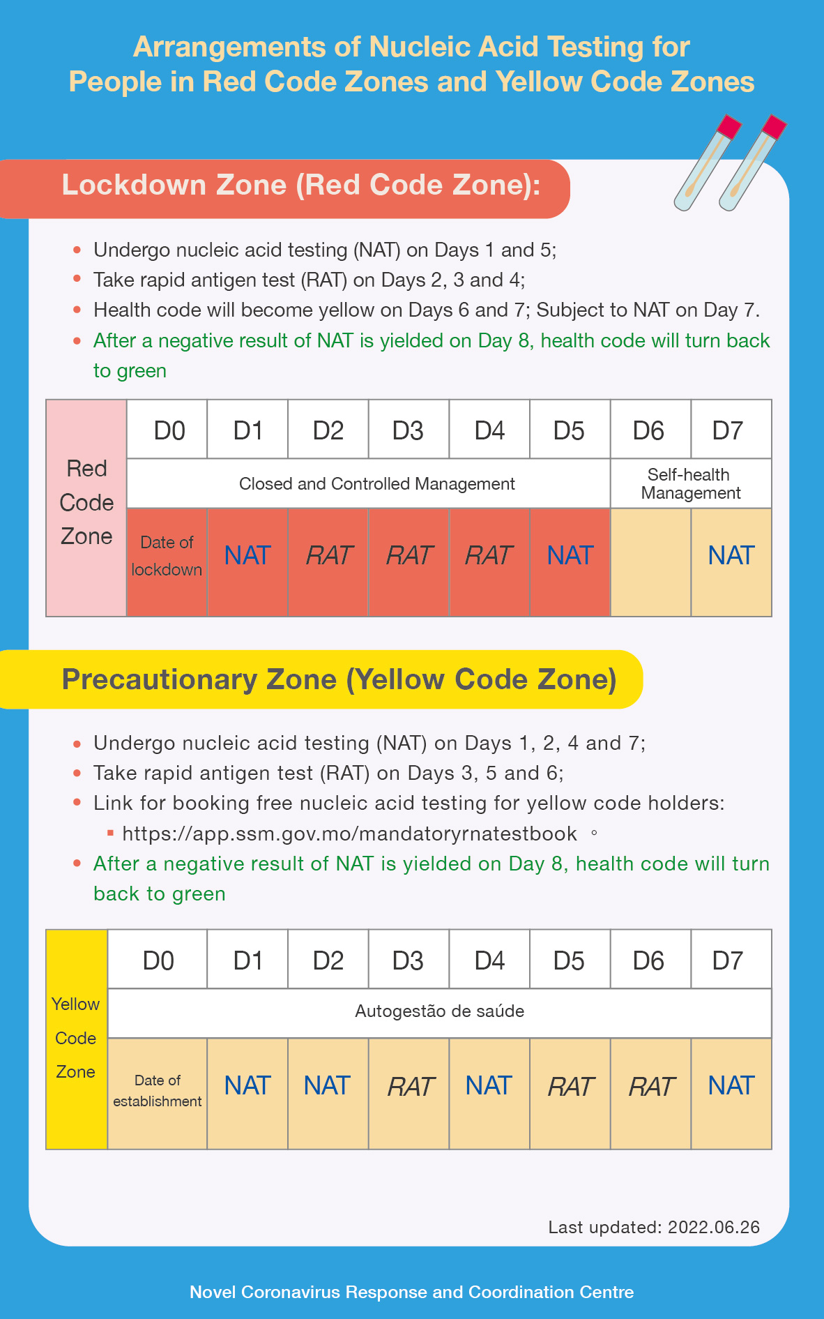You must take a NAT on days 1 and 5 after the building has been classified as a Red Code Zone (day 1 counts as the day after a building is given the designation). There will be testing units on-site, so there is no need to go to a testing centre. Additionally, you must take a RAT at home on days 2, 3 and 4 after the building has been classified as a Red Code Zone and upload the results onto the Macao Health Code.