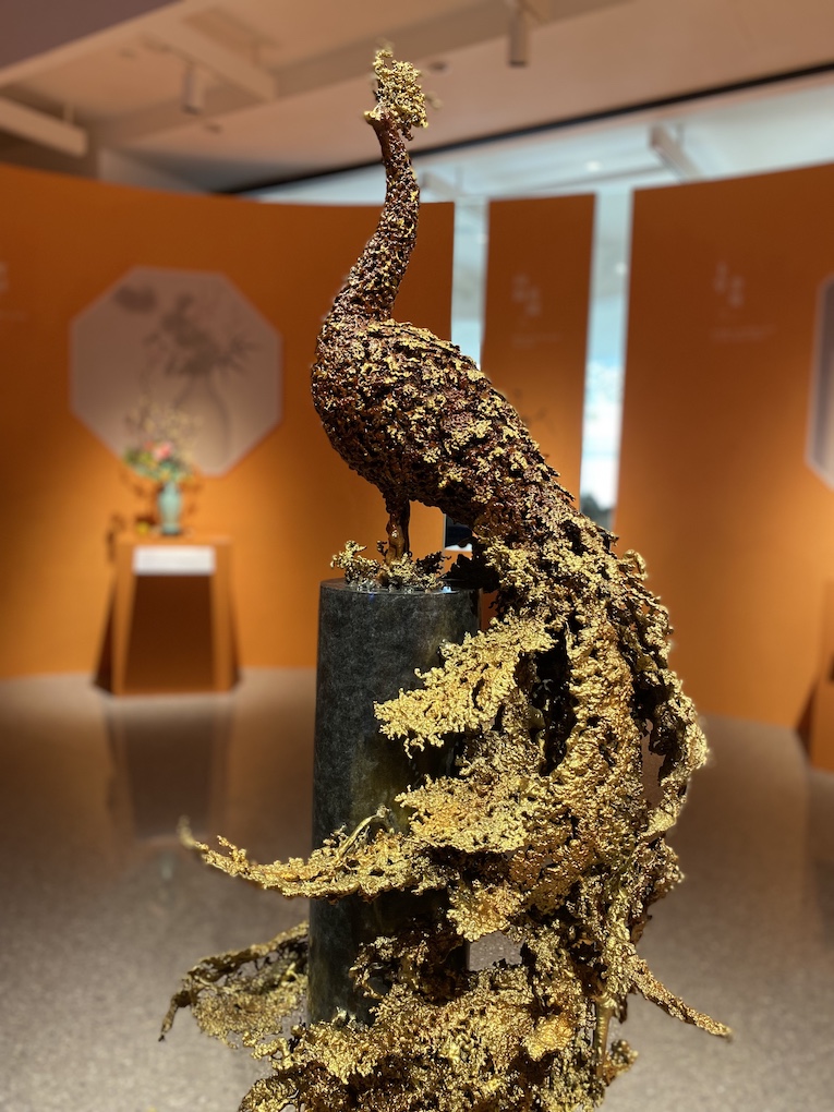 The Qīng Gòng series is meanwhile a joint display by Zhu and his son Zhu Junmin, who is also an acclaimed copper artisan. Zhu Junmin’s bonsai artworks use the molten copper technique to depict leaves and flowers through Eastern aesthetics. They also surround Emerald Plumes, Blossoming Grace, a spectacular peacock sculpture by his father.