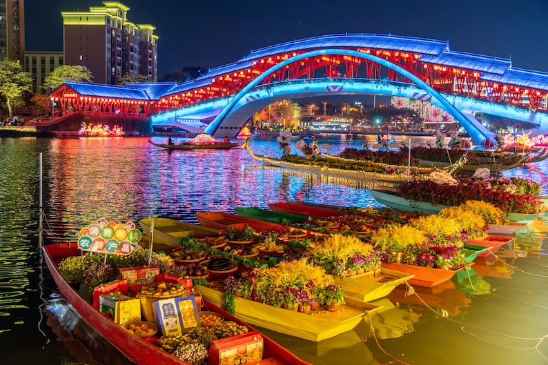 This annual floating flower market creates a gorgeous splash of colour across this waterside town in Foshan, and is complemented by a New Year’s goods market, a cultural and creative market, and spectacular entertainment events.